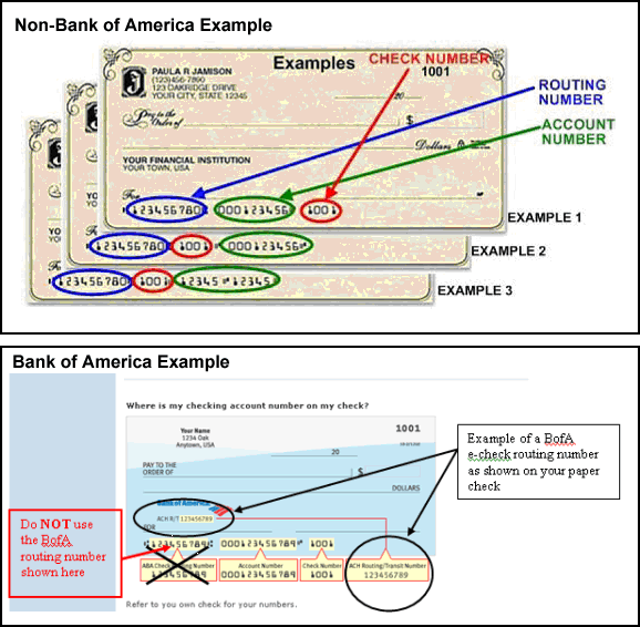 Bank of America uses different Routing Numbers for their E-Check transactions. DO NOT use the routing number shown on the bottom of a BofA check!